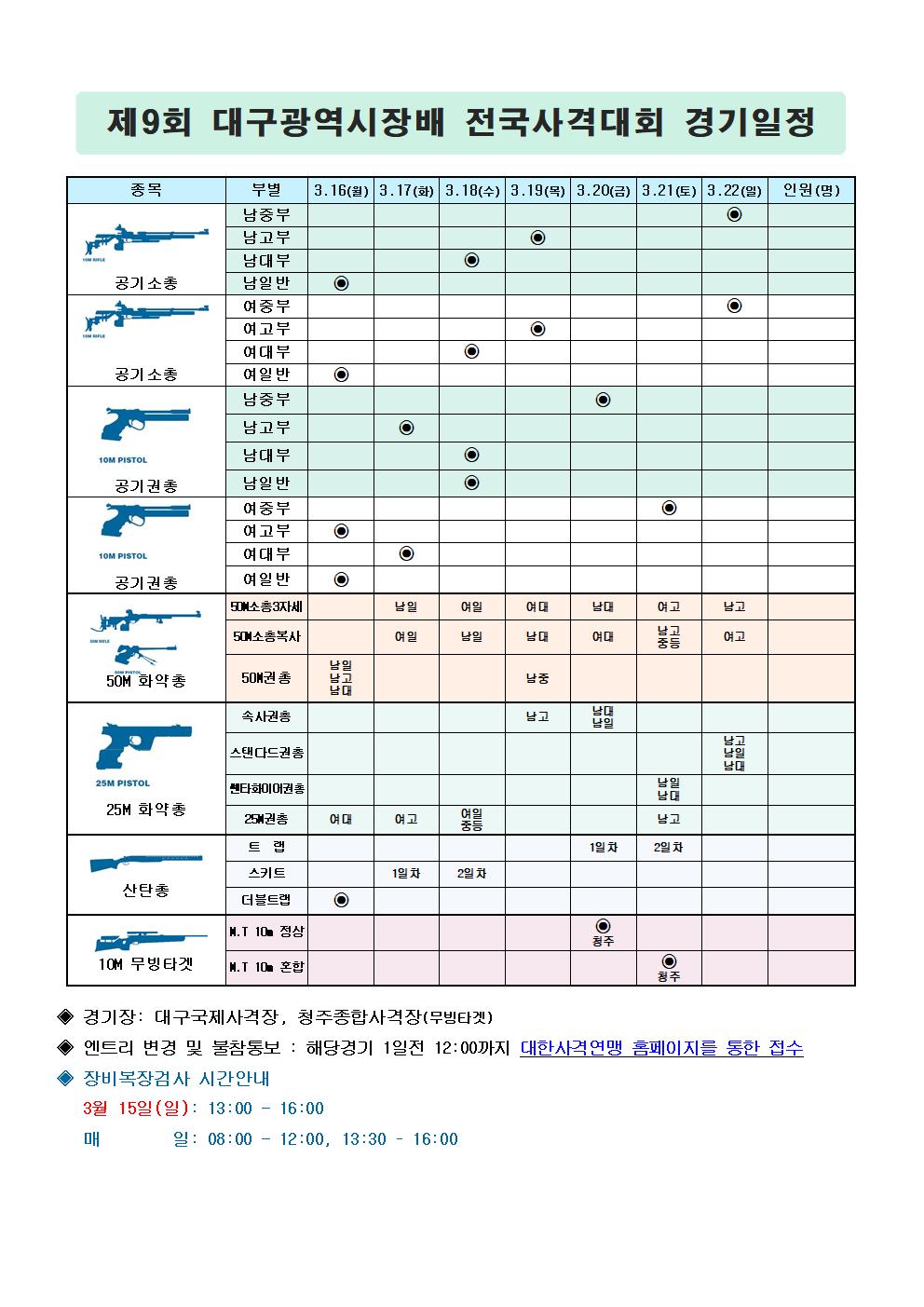°¡. ´ëȸ°³¿ä 1) ´ë ȸ ¸í : Á¦9ȸ ´ë±¸±¤¿ª½ÃÀå¹è Àü±¹»ç°Ý´ëȸ 2) ´ëȸ±â°£ : 2026. 3. 16.(¿ù) - . 22.(ÀÏ) [7Àϰ£] ¡Ø ¹«ºùŸ°Ù »çÀü°æ±â : ûÁÖÁ¾ÇÕ»ç°ÝÀå ¡Ø Âü°¡½Åû ¿Ï·á ÈÄ Âü°¡Àοø °í·ÁÇÏ¿© ¼¼ºÎÀÏÁ¤ È®Á¤°øÁö 3) Àå ¼Ò : ´ë±¸±¹Á¦»ç°ÝÀå 4) ÁÖÃÖ/ÁÖ°ü : ´ë±¸±¤¿ª½Ã, ´ë±¸±¤¿ª½Ã»ç°Ý¿¬¸Í 5) ÈÄ ¿ø : ´ë±¸±¤¿ª½Ã, ´ëÇÑ»ç°Ý¿¬¸Í, ´ë±¸±¤¿ª½Ã»ç°Ý¿¬¸Í 6) Á¾ ¸ñ : 10M °ø±â¼ÒÃÑ, 10M °ø±â±ÇÃÑ, 50M ¼ÒÃÑ º¹»ç, 50M ¼ÒÃÑ 3ÀÚ¼¼, 50M ±ÇÃÑ, 25M ¼Ó»ç±ÇÃÑ, 25M ½ºÅÄ´Ùµå ±ÇÃÑ, 25M ¼¾ÅÍÆÄÀÌ¾î ±ÇÃÑ, 25M ±ÇÃÑ, Æ®·¦, ´õºíÆ®·¦, ½ºÅ°Æ®, 10M ¹«ºùŸ°Ù(Á¤»ó/È¥ÇÕ) 7) Âü°¡´ë»ó : 2026 ¼±¼ö µî·ÏÀÚ·Î ÁßµîºÎ, °íµîºÎ, ´ëÇкÎ, ÀϹݺΠ³ª. 2026³â ¼±¹ßÀü Æ÷ÇÔ 1) 2026³â ²Þ³ª¹«¼±¼ö ¼±¹ßÀü 2) 2026³â û¼Ò³â ´ëÇ¥¼±¼ö ¼±¹ßÀü 3) 2026³â ¼¼°èÁִϾ¼ö±Ç´ëȸ(±¹°¡´ëÇ¥ Èĺ¸¼±¼ö) ¼±¹ßÀü ¡Ø ¼¼ºÎ ´ëȸ¹æÄ§Àº ȨÆäÀÌÁö(www.shooting.or.kr) °øÁö»çÇ× ÂüÁ¶ ´Ù. Âü°¡½Åû 1) ½Åû±â°£ : 2026. 2. 19.(¸ñ) - 3. 9.(¿ù) 17:00 ±îÁö 2) ½Åû¹æ¹ý °¡) ´ëÇÑ»ç°Ý¿¬¸Í ȨÆäÀÌÁö www.shooting.or.kr Âü°¡½Åû Á¢¼ö ³ª) ¼Ò¼ÓÆÀ ¼±¼ö´Â ¼Ò¼ÓÆÀ ´ÜüID·Î ½Åû(ÀϹݼ±¼ö´Â °³ÀÎID Âü°¡½Åû) ´Ù) Âü°¡½Åû ½Ã Ãѱâ Á¤º¸ÀÔ·Â(Àåºñ°Ë»ç ÀÚ·á Ȱ¿ë) ¶ó) Çлý¼±¼ö(´ëÇлý Á¦¿Ü) Âü°¡½Åû ½Ã Çб³Àå È®Àμ ¹× 24¼¼ ÀÌÇÏ ¼±¼ö(ÀϹݺΠÆ÷ÇÔ) Çб³Æø·Â óºÐÀÌ·Â ºÎÁ¸Àç ¼¾à¼ ÷ºÎ Çʼö ¡Ø ´ëÇÑ»ç°Ý¿¬¸Í ȨÆäÀÌÁö °¢Á¾¼½Ä ¾ç½Ä ÂüÁ¶ ¡Ø Çб³Àå È®Àμ ȨÆäÀÌÁö ÷ºÎ½Ã 1°³ ÆÄÀÏ·Î ÅëÇÕÇÏ¿© ÷ºÎ¿äû ¸¶)Âü°¡½Åû Á¢¼ö½Ã µî·ÏÇÑ Ãѱâ´Â ´ëÇÑ»ç°Ý¿¬¸Í¿¡¼ Àϰý °ø±âÃÑ º¸°üÇØÁ¦ ½Åû (ÀϹݼ±¼ö Á¦¿Ü) ¡Ø Âü°¡½Åû ¸¶°¨ ÈÄ º¯°æµÈ Ãѱâ´Â °üÇÒ °æÂû¼¿¡¼ °³º° Çã°¡°ø¹® ÁöÂü ÈÄ ´ëȸº»ºÎ µî·Ï ¹Ù) º¯°æ ¹× ºÒÂü½ÅûÀº ÇØ´ç °æ±â ÀüÀÏ 12:00±îÁö ´ëÇÑ»ç°Ý¿¬¸Í ȨÆäÀÌÁö Á¢¼ö 3) Âü °¡ ºñ(¼¼ºÎÁ¾¸ñº° ±âÁØ) (´ÜÀ§: ¿ø)