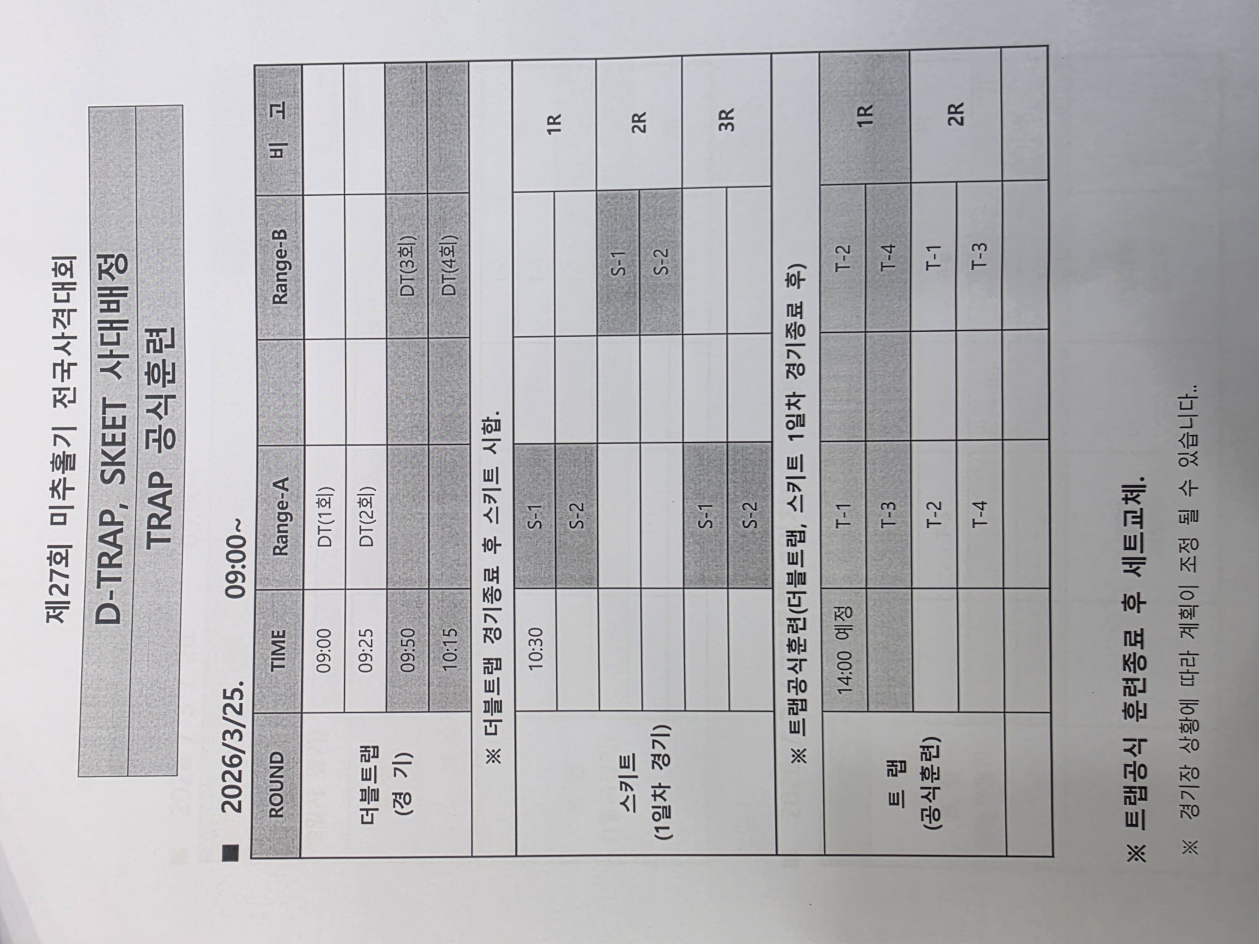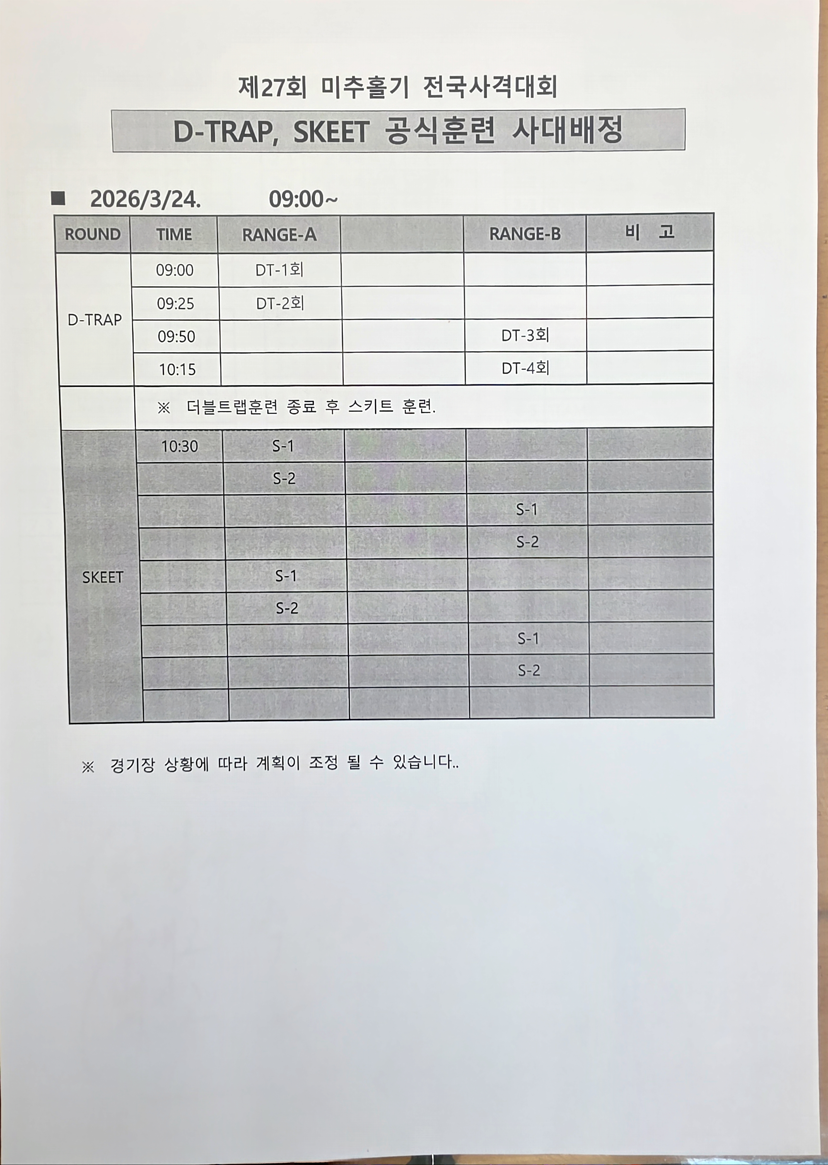 Á¦27ȸ ¹ÌÃßȦ±â Àü±¹»ç°Ý´ëȸ »êźÃÑ Á¾¸ñÀÇ °æ±âÀÏÁ¤, °ø½ÄÈÆ·Ã ¹× »ç´ë¹èÁ¤Ç¥¸¦ ÷ºÎÇÏ¿© ¾È³»µå¸³´Ï´Ù.