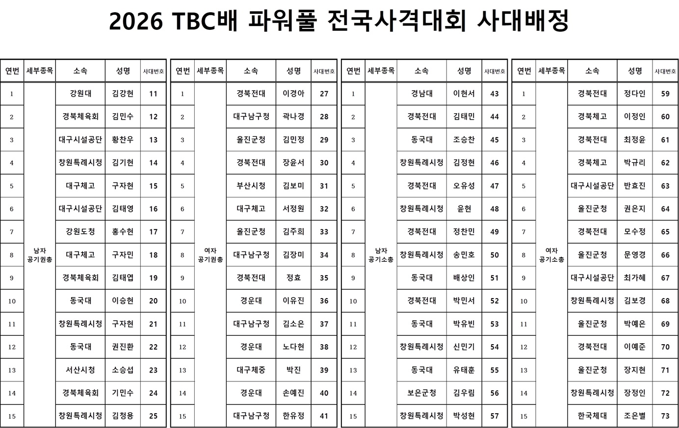 | Á¦¸ñ | 2026 TBC¹è ÆÄ¿öÇ® Àü±¹»ç°Ý´ëȸ °ø±âÃÑ ´ëȸ ÀÏÁ¤ ¹× »ç´ë¹øÈ£Ç¥ °øÁö | |||||||||||||||||||||||||||||||||||