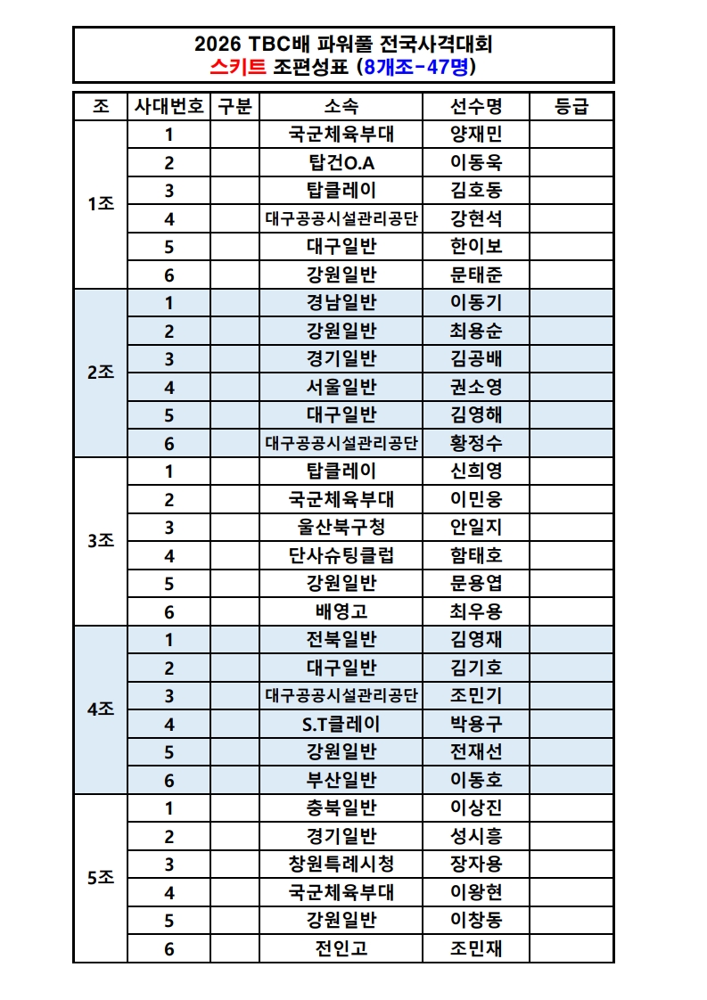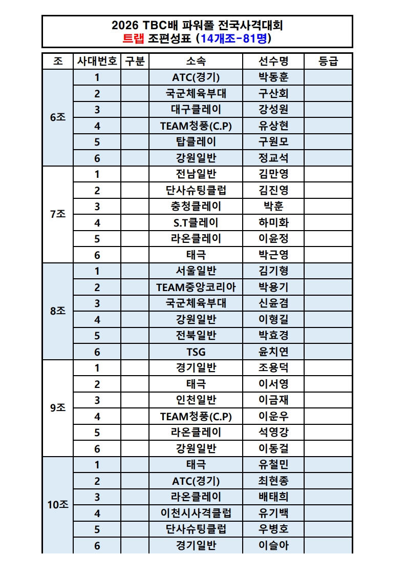 | Á¦¸ñ | 2026 TBC¹è ÆÄ¿öÇ® Àü±¹»ç°Ý´ëȸ »ç´ë¹èÁ¤Ç¥ ¹× Á¶Æí¼ºÇ¥ °øÁö(µî±Þ ºÐ·ùÇ¥ Æ÷ÇÔ) | ||||