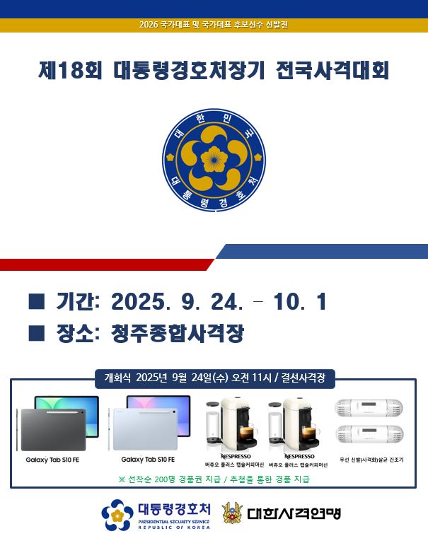 Á¦18ȸ ´ëÅë·É°æÈ£Ã³Àå±â Àü±¹»ç°Ý´ëȸÀÇ ¼º°øÀûÀÎ °³ÃÖ¸¦ ±â¿øÇϸç, °³È¸½ÄÀ» ¾Æ·¡¿Í °°ÀÌ ÁøÇàÇÕ´Ï´Ù. ¡ß °³È¸½Ä ÀÏÁ¤ ¡ß - ÀϽÃ: 2025³â 9¿ù 24ÀÏ(¼ö) ¿ÀÀü 11½Ã - Àå¼Ò: ûÁÖÁ¾ÇÕ»ç°ÝÀå °á¼±Àå ¡ß °³È¸½Ä Ưº° À̺¥Æ® ¡ß °³È¸½Ä¿¡ Âü°¡ÇÏ´Â ¼±¼ö´ÜÀ» ´ë»óÀ¸·Î ¼±Âø¼ø 200¸í¿¡°Ô °æÇ°±ÇÀ» Áö±ÞÇÕ´Ï´Ù. °æÇ°±ÇÀº °³È¸½Ä ÇöÀå¿¡¼ Ãß÷À» ÅëÇØ ¾Æ·¡¿Í °°Àº ǪÁüÇÑ °æÇ°À¸·Î À̾îÁý´Ï´Ù. ¡ß °æÇ° ³»¿ª¡ß °¶·°½ÃÅÇ S10 FE (2´ë) ³×½ºÇÁ·¹¼Ò Ä¿ÇǸӽűâ (2´ë) ¹«¼± ½Å¹ß(»ç°ÝÈ) »ì±Õ °ÇÁ¶±â (2´ë) ¼±¼ö´Ü ¿©·¯ºÐÀÇ ¸¹Àº Âü¿©¿Í ¼º¿øÀ» ºÎʵ右´Ï´Ù ~!
